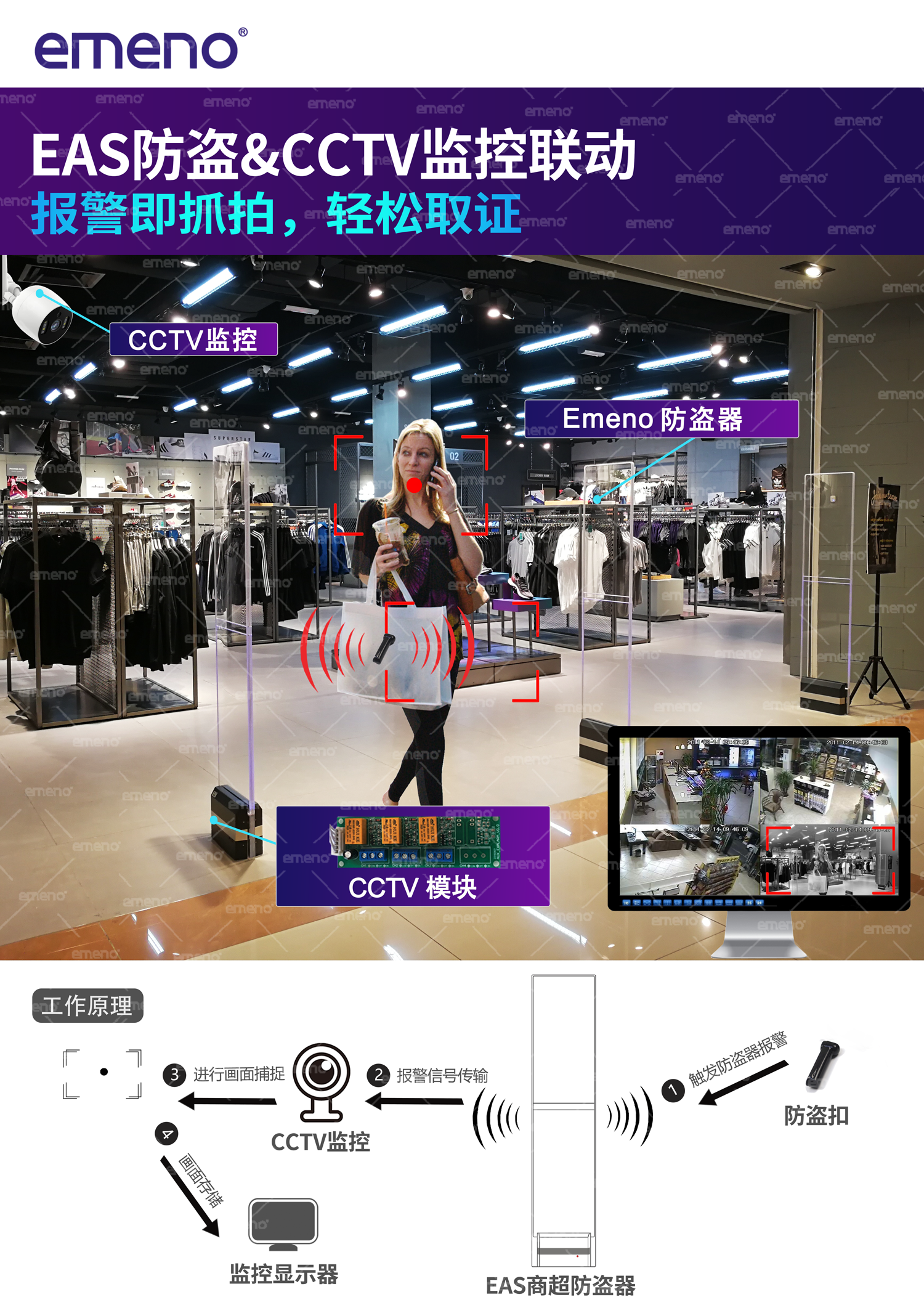 為了幫助店鋪解決偷竊者后續(xù)的調(diào)查取證難題,立方美emeno自主開發(fā)了CCTV監(jiān)控聯(lián)動功能,在EAS商超防盜系統(tǒng)上安裝CCTV監(jiān)控模塊,便可以與監(jiān)控?cái)z像頭進(jìn)行聯(lián)動!